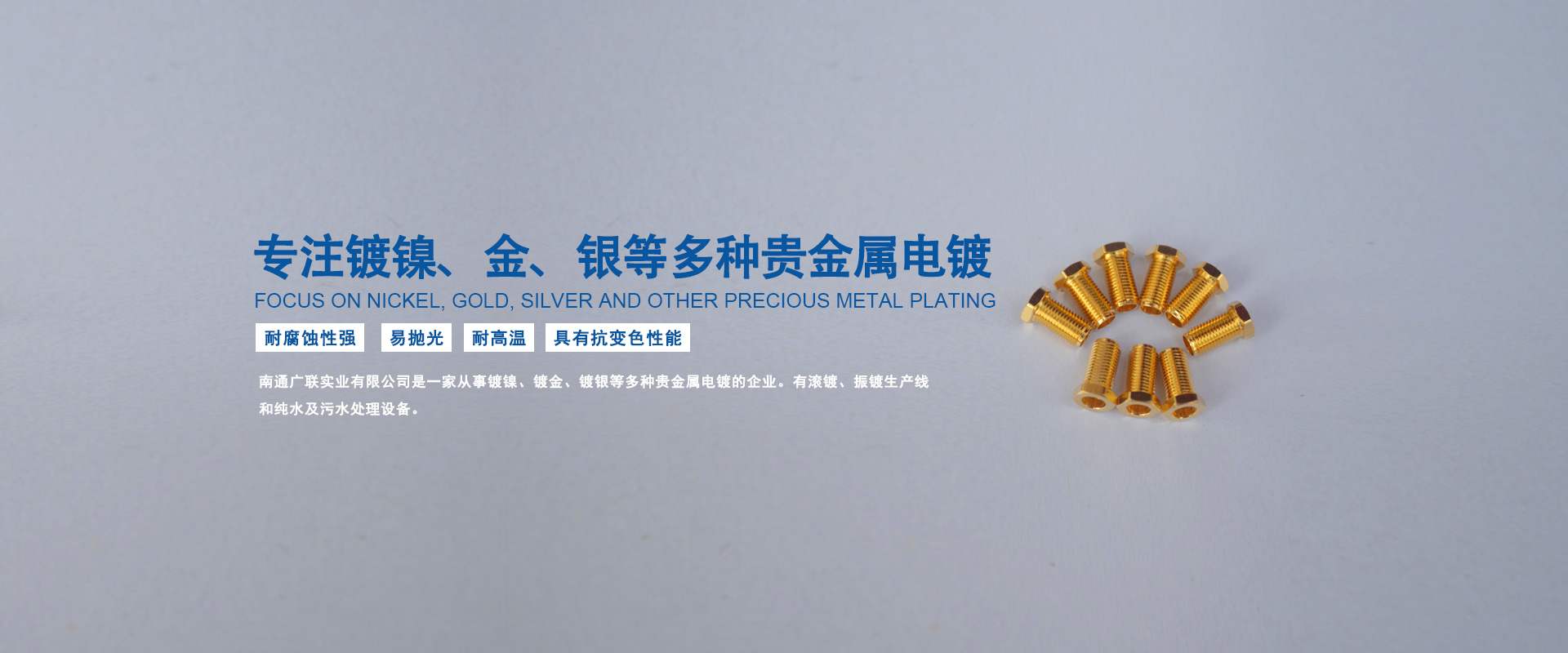 南通廣聯(lián)實業(yè)有限公司是一家從事鍍鎳、鍍金、鍍銀等多種貴金屬電鍍的企業(yè)。有滾鍍、振鍍生產(chǎn)線和純水及污水處理設備。